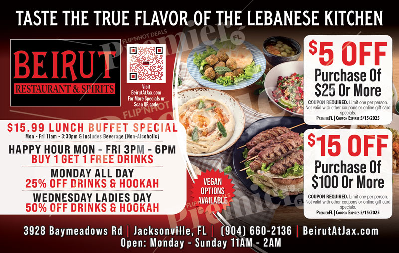 Beirut Restaurant & Spirits brings the true flavor of the Lebanese kitchen to Jacksonville. Located on Baymeadows Road, Beirut offers traditional Middle Eastern cuisine, handcrafted cocktails, hookah, and a vibrant dining atmosphere perfect for lunch, dinner, and late-night gatherings.
