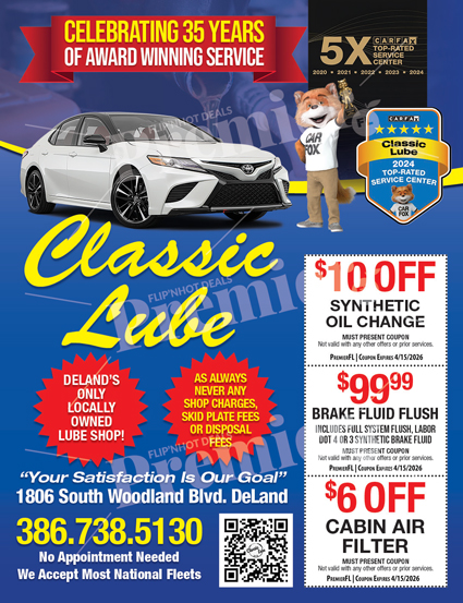 Classic Lube is a locally owned and operated automotive service center providing fast and dependable oil changes and preventative maintenance in Deland Florida. With over 35 years of award-winning service, Classic Lube has built a strong reputation for honest pricing, professional care, and efficient vehicle maintenance. Their experienced technicians focus on keeping vehicles running smoothly while delivering friendly, customer-first service.