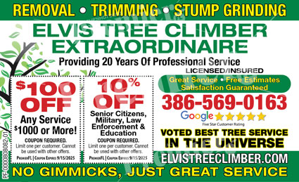 Elvis Tree Climber Extraordinaire offers professional tree trimming, removal, and stump grinding across Volusia County. With more than two decades of hands-on experience, they’re known for precision cuts, fair pricing, and outstanding safety practices.